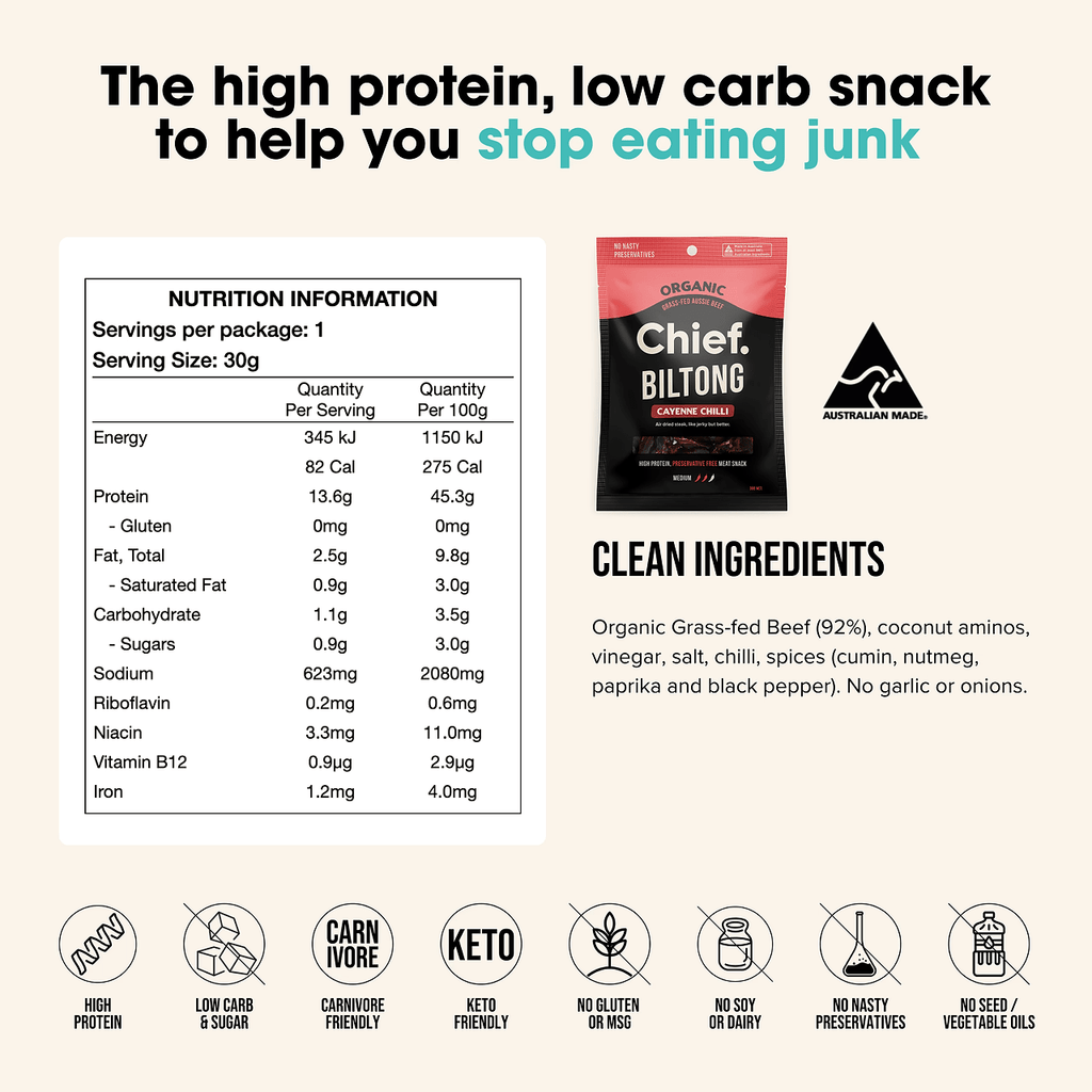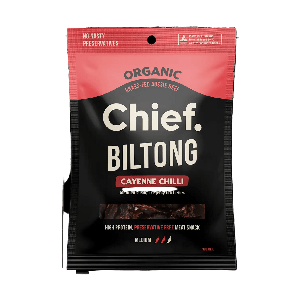 When you want a clean snack to satisfy your savoury cravings, you'll love Chief organic biltong. Just like slow cooking is better than zapping in a microwave, Chief slow air dry our meat which means it's naturally more tender and healthier than jerky.