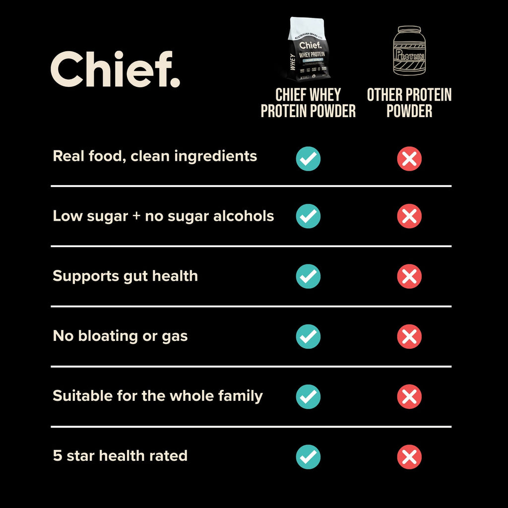 Australian-made WPC from grass-fed dairy with a smooth vanilla taste. 23 g protein per 30 g serve, naturally rich in BCAAs, low in sugar, and free from gums, fillers and artificial sweeteners.