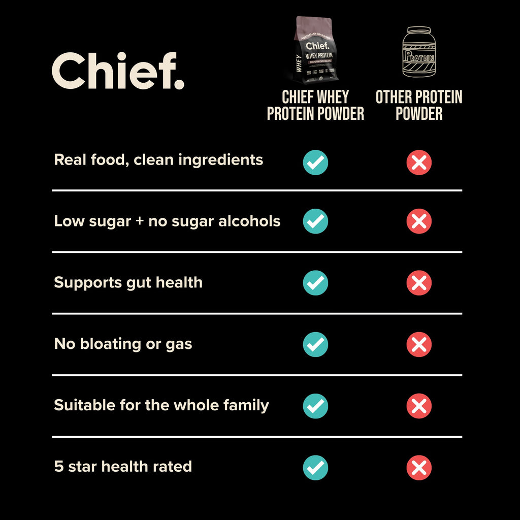 Australian-made WPC with alkalised cocoa for a rich, creamy chocolate taste. 22 g protein per 30 g serve, naturally low in sugar, and free from gums, fillers and artificial sweeteners.