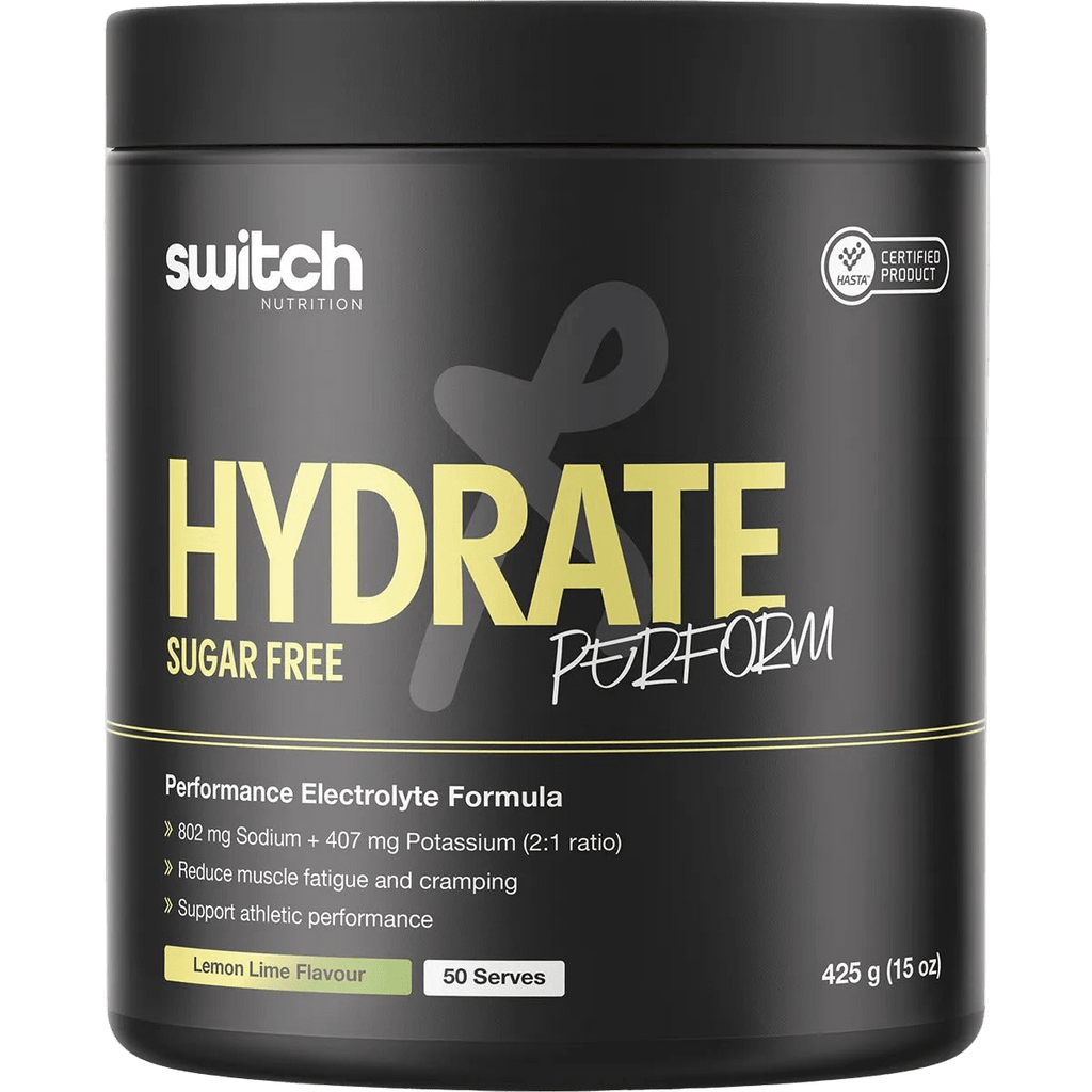 Switch Nutrition Hydrate Perform Sugar Free Lemon Lime is a high-performance hydration formula with a clinically aligned 2:1 sodium-to-potassium ratio, 5 essential electrolytes, 1,000 mg taurine, and zero sugar. HASTA Certified for banned-substance testing, it’s built for serious training, competition, and everyday hydration.