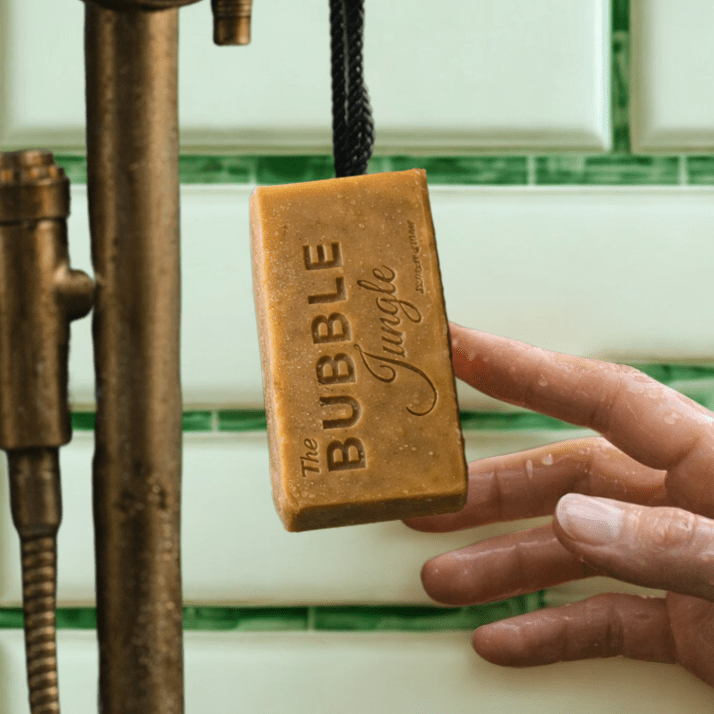 Coloured naturally with annatto root and finished with a sturdy forest-green rope, this bar is practical, beautiful, and built to hang dry between uses — no slippery mess, just pure, fresh functionality.