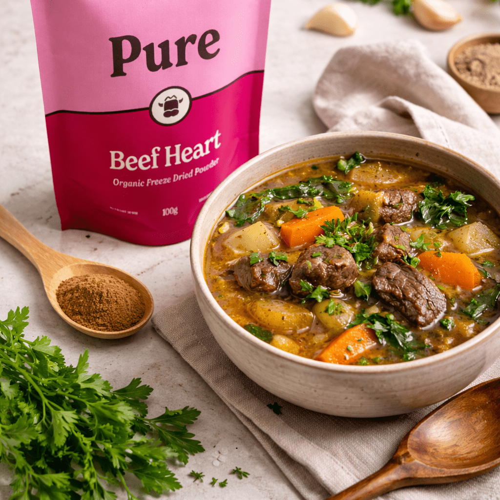 Prime Seasoning Organic Freeze-Dried Beef Heart Powder is made from 100% certified organic, grass-fed and finished Australian bovine heart. The gentle freeze-drying process preserves nutrients while creating a fine powder that blends easily into meals.