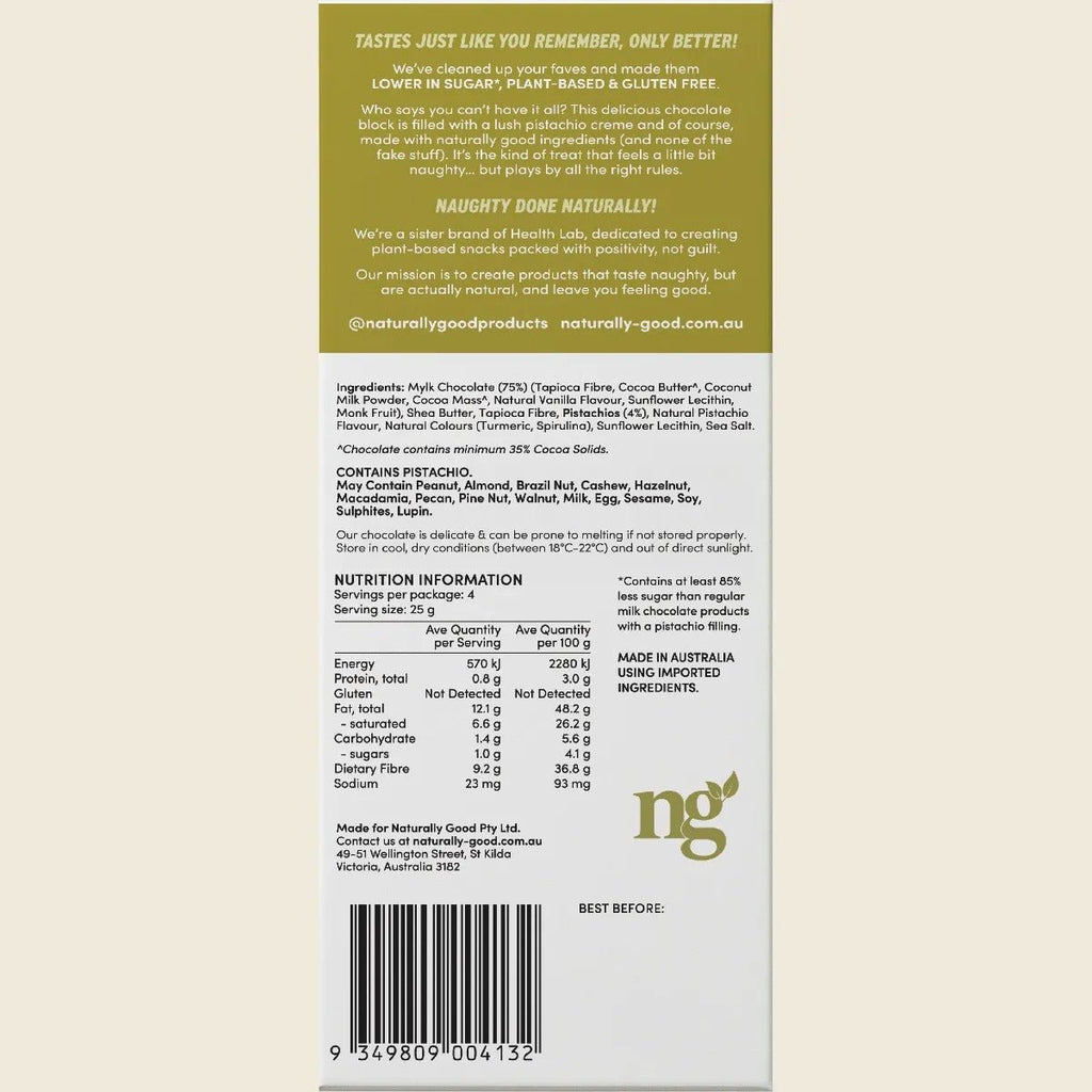 When creamy chocolate meets pistachio perfection, every bite feels like a little luxury. Naturally Good combines smooth, velvety vegan mylk chocolate with a rich pistachio crème centre that’s nutty, indulgent and genuinely satisfying.