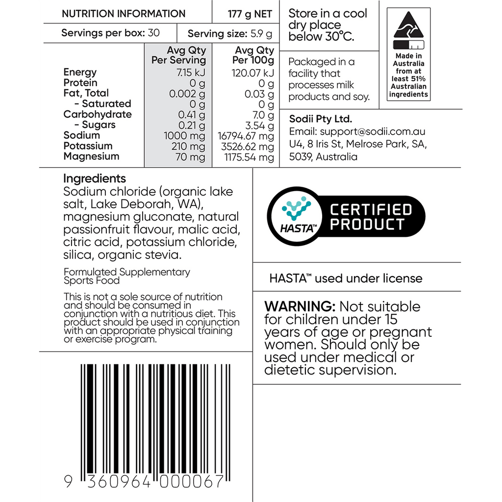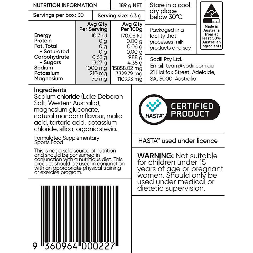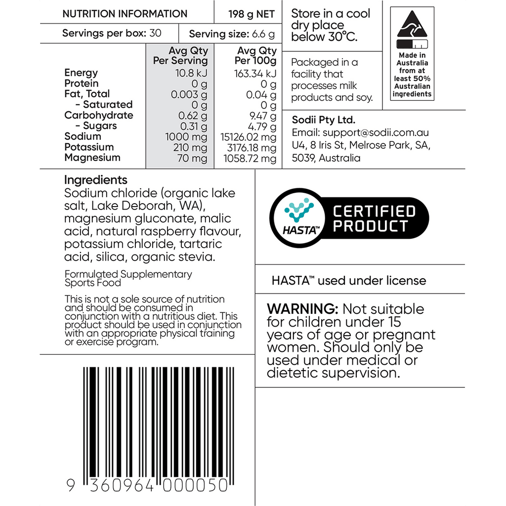 Sodium Chloride (Organic Lake Salt, Lake Deborah, WA), Magnesium Gluconate, Malic Acid, Natural Raspberry Flavour, Potassium Chloride, Tartaric Acid, Silica, Organic Stevia.