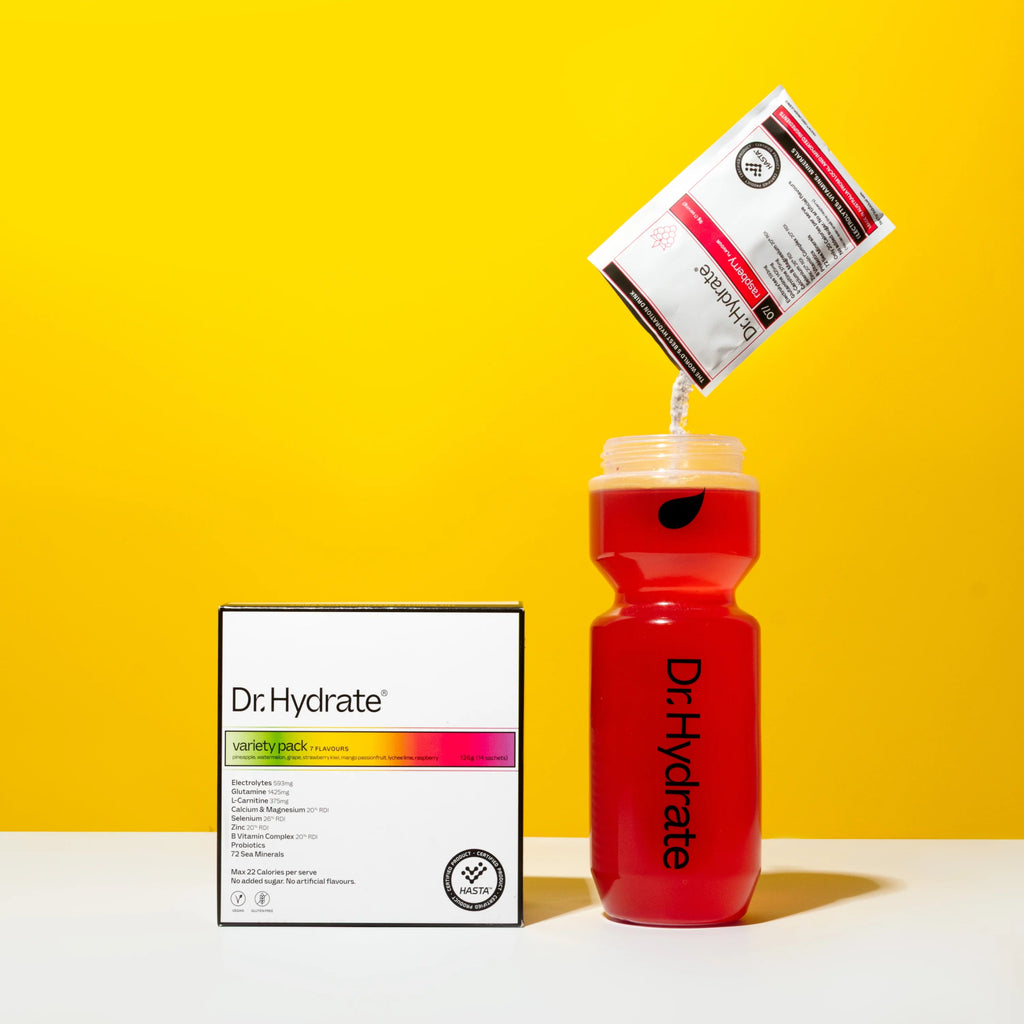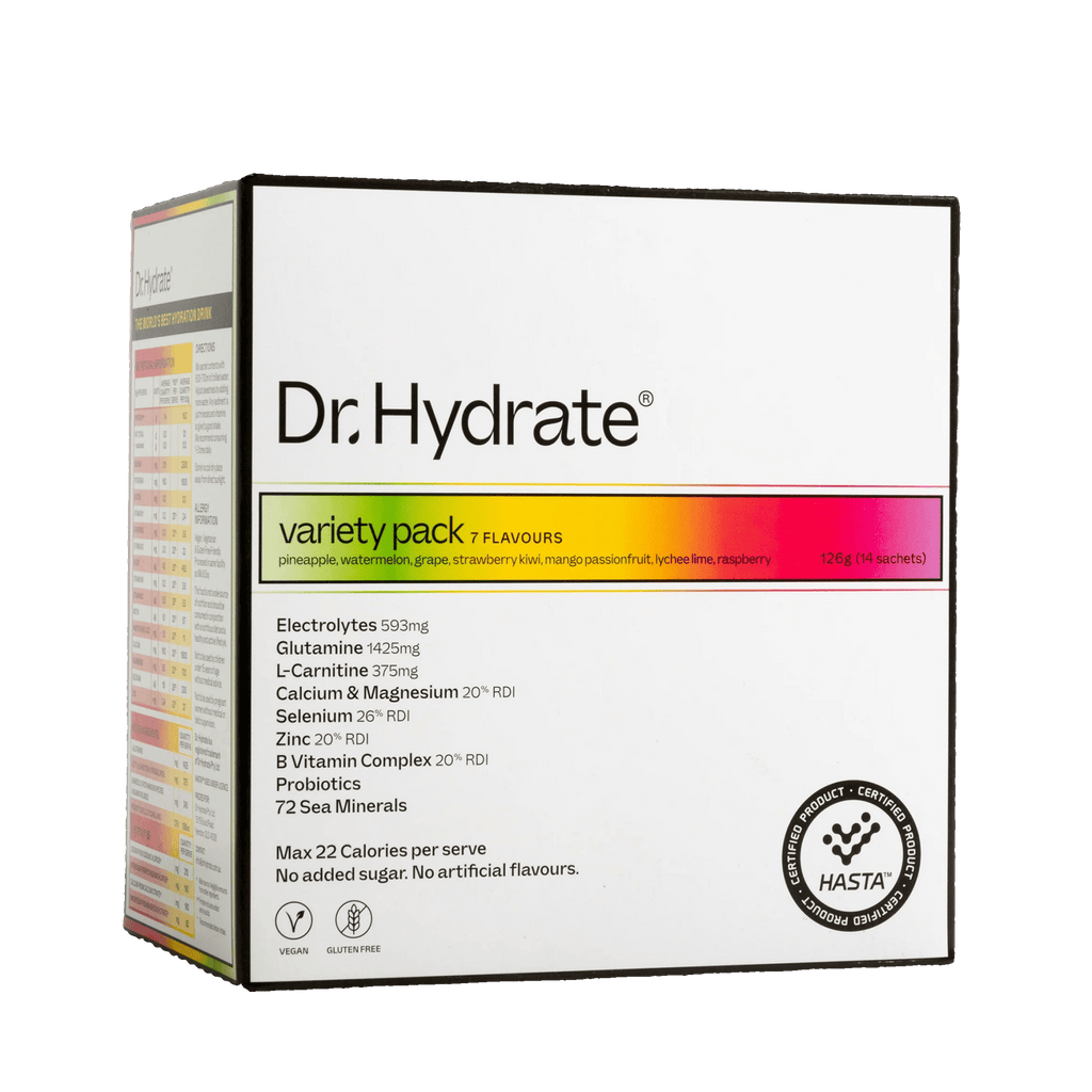 Like to keep things interesting? The Dr. Hydrate variety pack has 14 sachets, with 2 of each of the following delicious flavours: raspberry, lychee lime, pineapple, watermelon, grape, strawberry kiwi and mango passion fruit