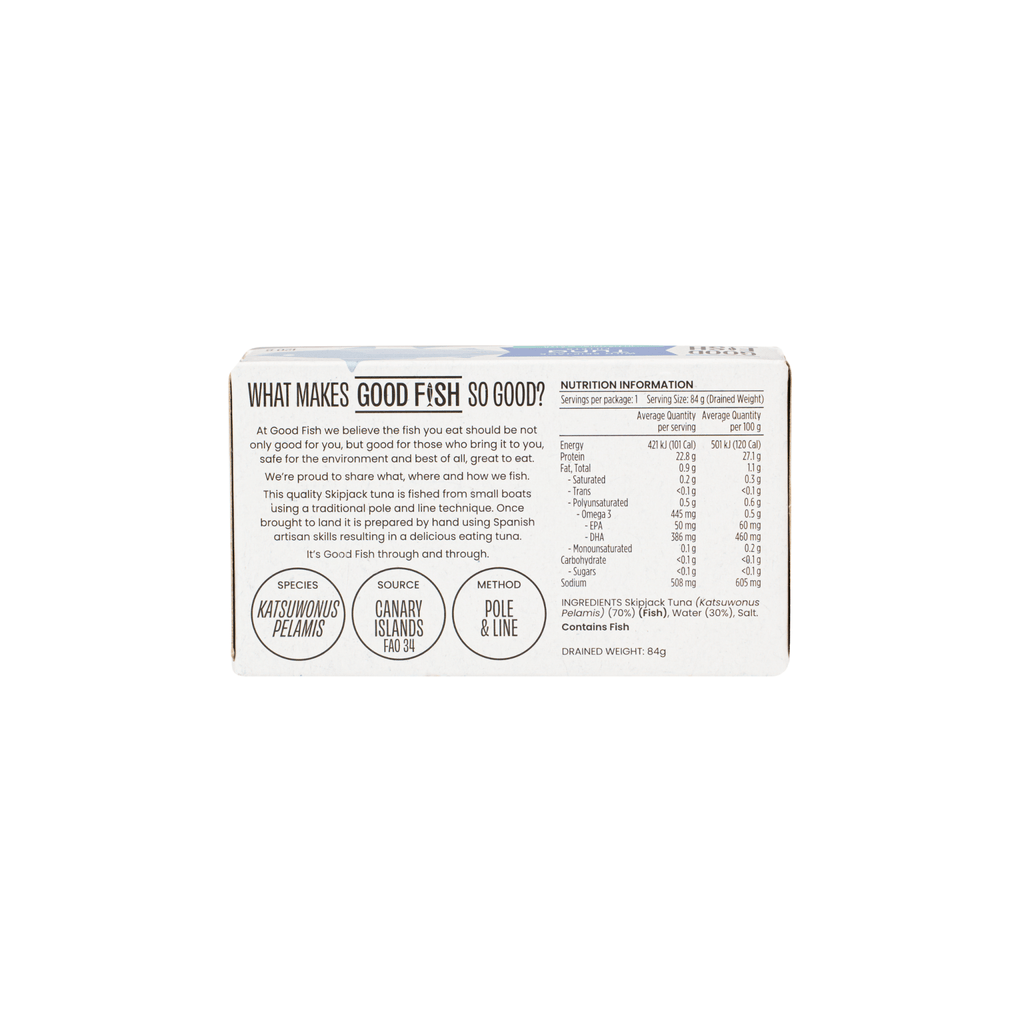 Good Fish premium, line-caught tuna is found in the beautiful and deep waters off the Canary Islands. Good Fish source only skipjack tuna, the most sustainable and unthreatened species, and use only one hook per line. This tender, delicious fish is stored on ice as soon as it's caught, and is cooked and hand-filleted using age-old artisan methods. No chemicals, no nasties. Just generous, delicious fillets, ready to enjoy.